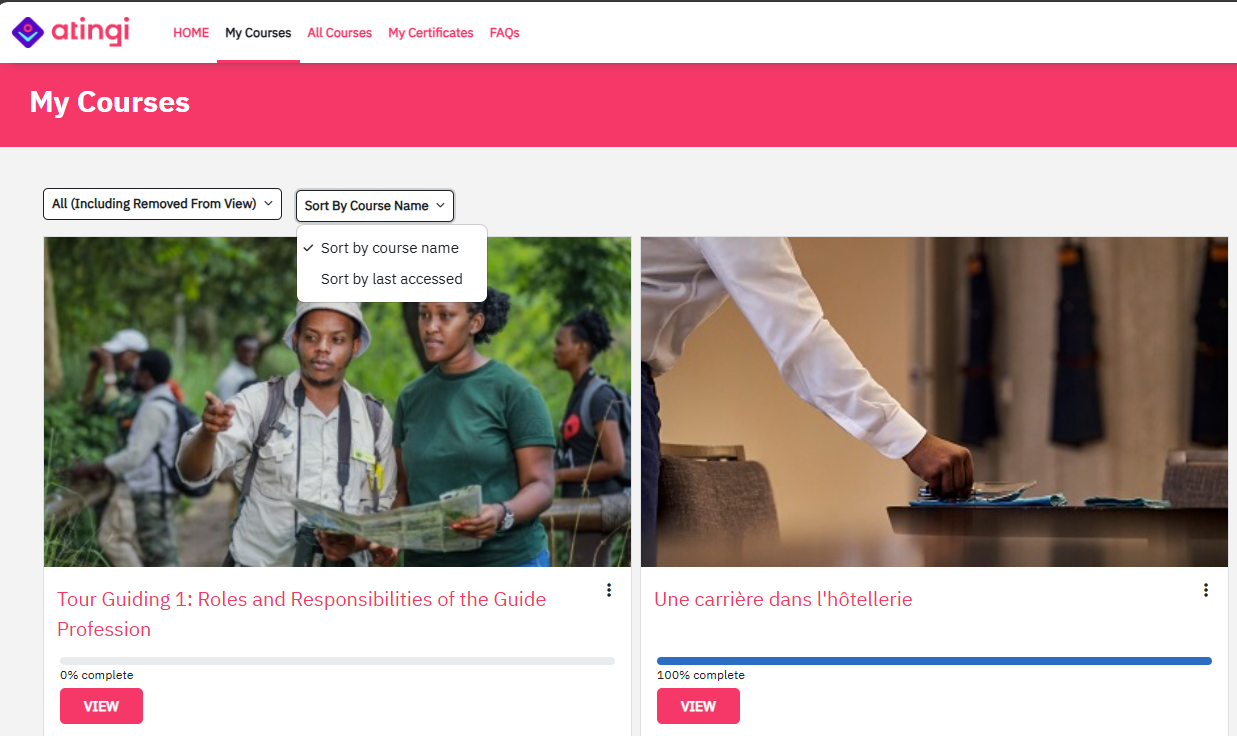 You can choose to sort the courses by name or by last access or search for a specific course. To enter them again, just click on “view”.