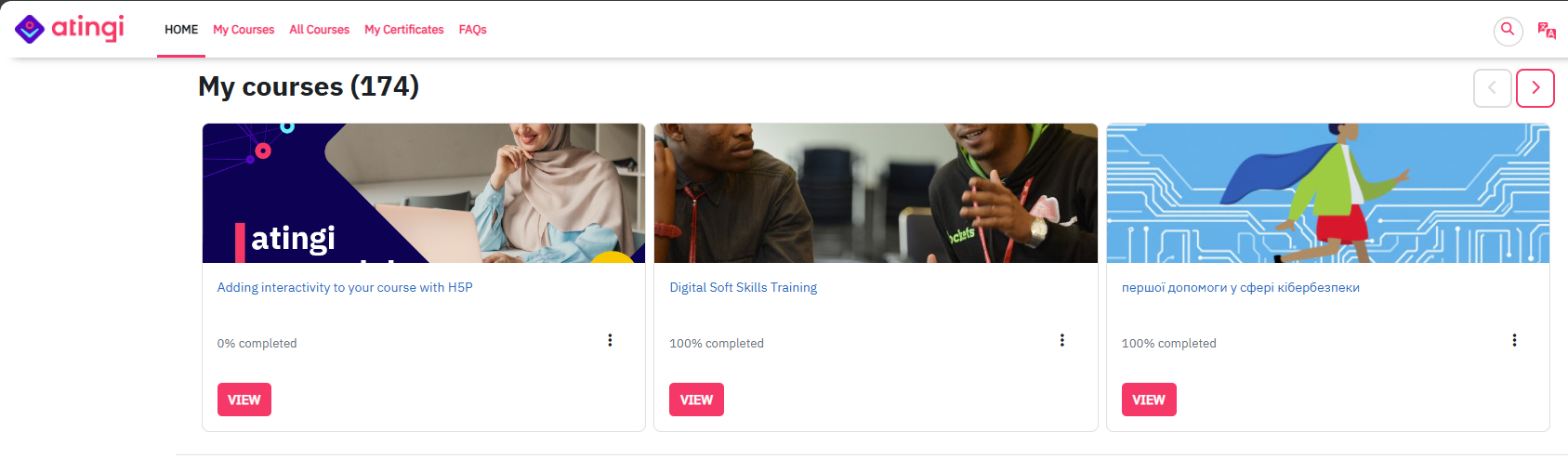 After you have found a course that interests you and that you have enrolled in, you can always come back to continue learning. Just log in to you atingi account as usual and click on “My courses” in the top bar.
