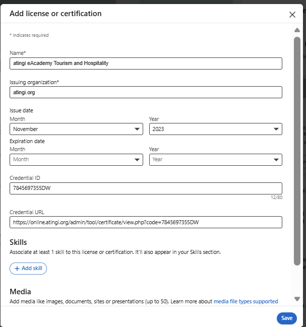 - Scroll down your LinkedIn profile page to the Licenses & Certification section (or add it to your account using “Add section” feature in case you don’t yet have one)