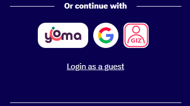 At the bottom of the page, it says "Or Continue with". If you have @giz.de email, please click the 'GIZ' button. If you have a Gmail email account, please click on the “G” button. If you have a YOMA Account, please click on the “YOMA” button.