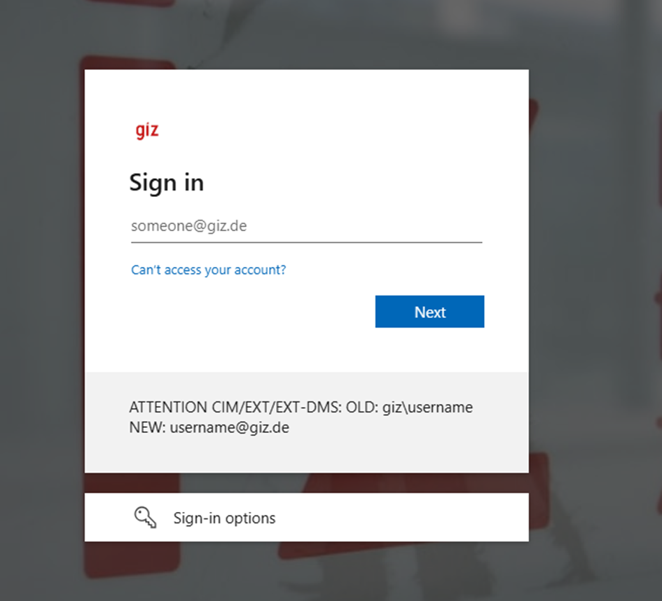 If you have clicked the “GIZ” button, you will be redirected to the GIZ log in page. Enter your email address and password connected to your GIZ account here and click “Next”.