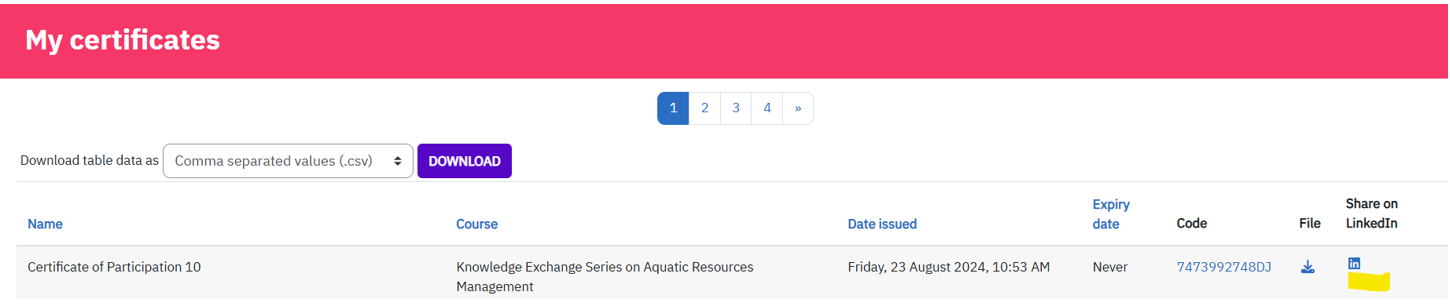The atingi certificate is a simple, customizable, digital PDF, which is automatically issued to each learner who completes the course once it has been set up as an ‘activity’ into your course. Learners can then download the certificate as a PDF and email or print it or share their certificate on their LinkedIn account. If you go to “my certificates” you can see the LinkedIn sharing button next to each certificate that is awarded to a learner.
