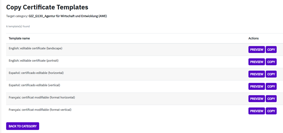 - Select the one you like per language and format of certificate (portrait or landscape) and click on “preview” to take a look at the certificate template and click “copy” to add a copy of the template into your category