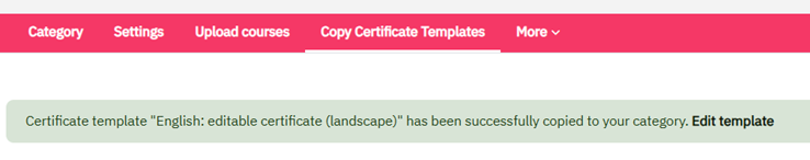 - On top of your screen, you will see a green text field indicating that the template was copied successfully in your category. Click on “Edit template” to go to the newly copied certificate