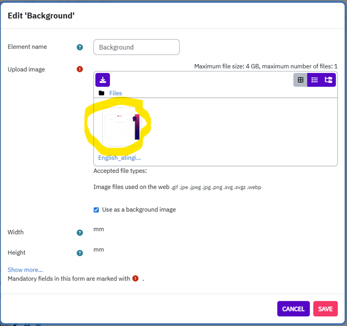 Then, upload your pre-designed background image via drag & drop, or by clicking on the purple folder icon (add’). Ensure that the checkbox next to “use as background image” is clicked and click on “save”. Now your background image will appear instead of the atingi one.