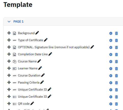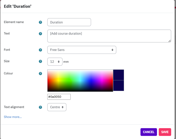 To delete fields from the template simply click on the bin icon next to the respective field name on the menu on the left side. For example, if you do not want to add the duration of the course on your certificate, just click on the bin icon next to “course duration” to delete this text field.