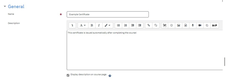 You should give the certificate’s activity a name, and a description for learners.