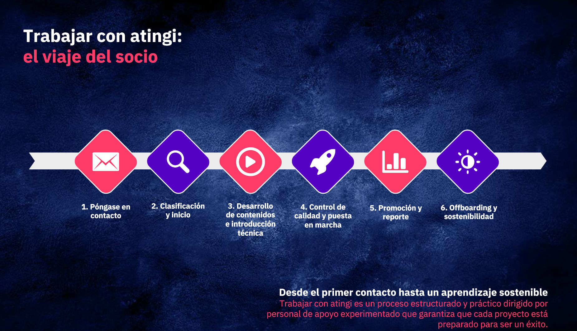 Si decide seguir adelante con atingi y ha seleccionado un paquete de servicios (estaremos encantados de asesorarle sobre los paquetes de servicios), le enviaremos una orden de servicio que deberá ser aprobada por su responsable en el proyecto. Tras el acuerdo mutuo, su responsable personal de éxito del cliente de atingi programará una reunión inicial para aclarar cualquier cuestión pendiente y los pasos siguientes. También obtendrá acceso a su propia "categoría" en atingi, donde podrá crear nuevos cursos y añadir contenidos.