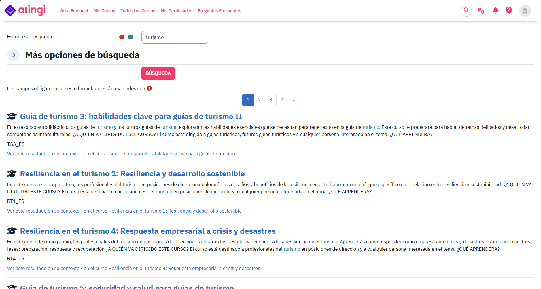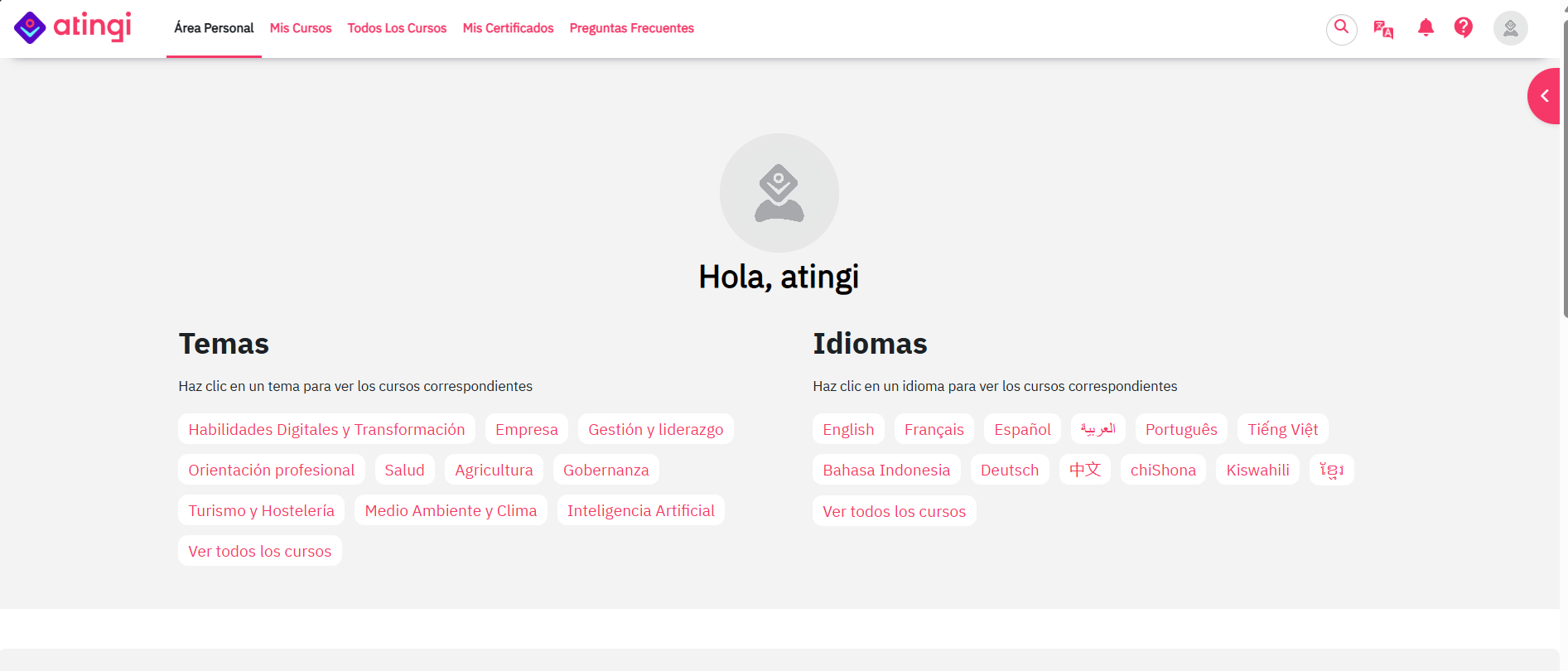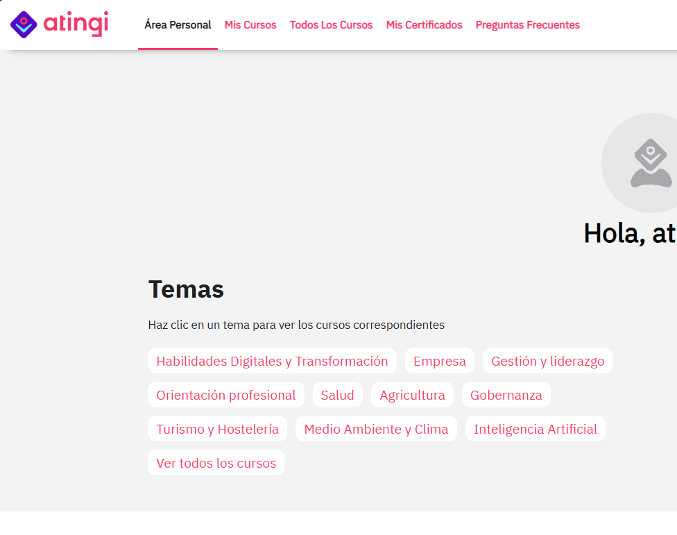 Otra forma de encontrar cursos desde cualquier punto de atingi es utilizando la función de búsqueda. Simplemente escribe un tema, frase, palabra o título de curso que te interesa, y presiona "Ingresar" para iniciar la búsqueda.