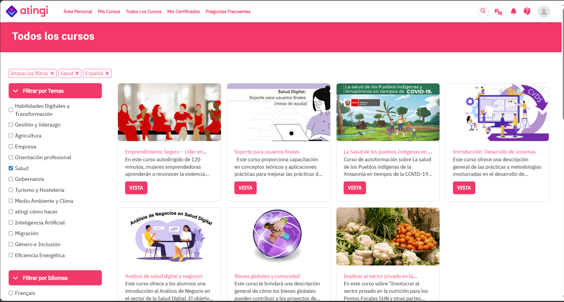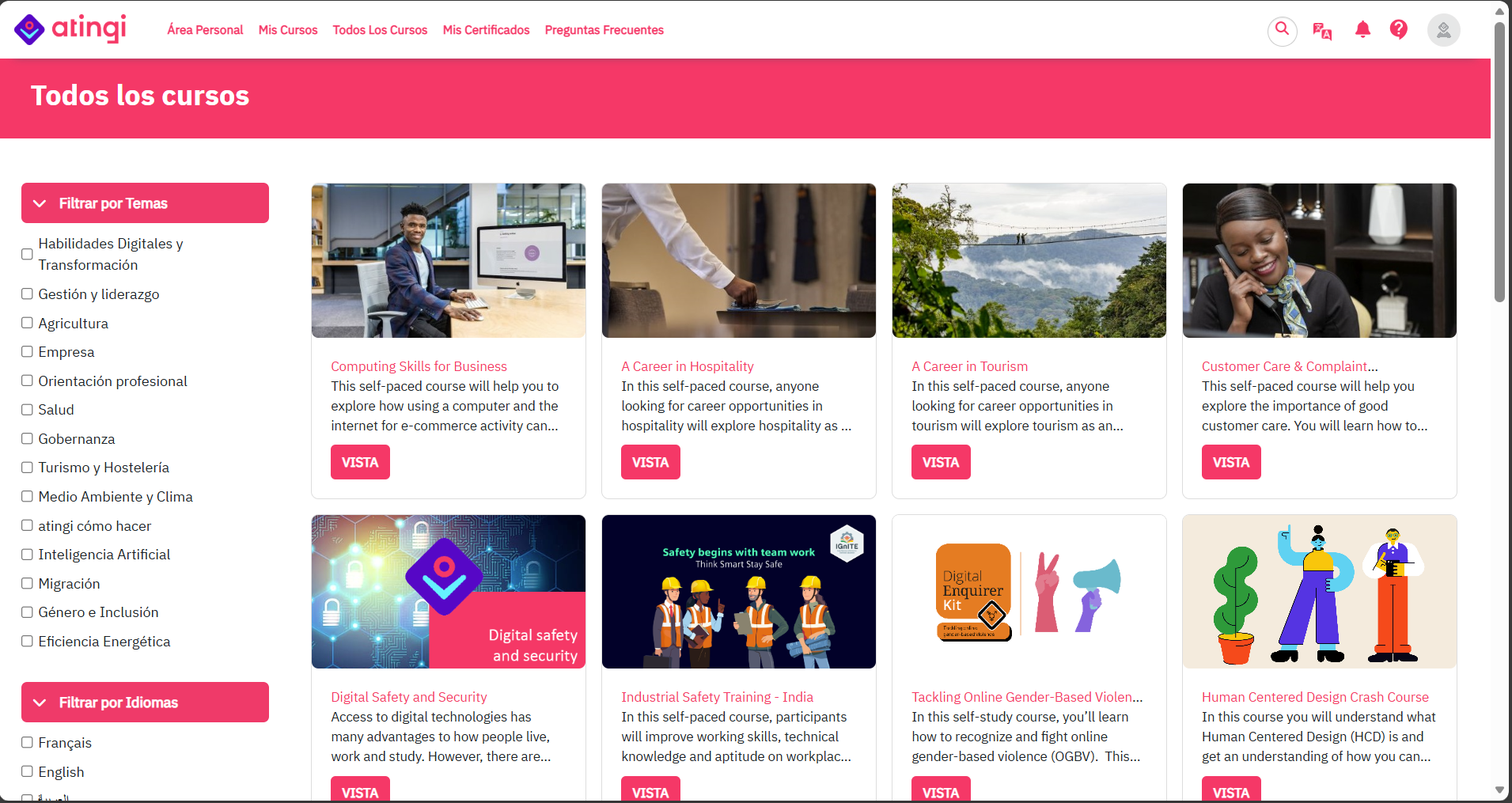 No importa qué camino elijas, siempre accederás a la liste de "Todos Los Cursos" que contiene todos los cursos de atingi que están disponibles públicamente.