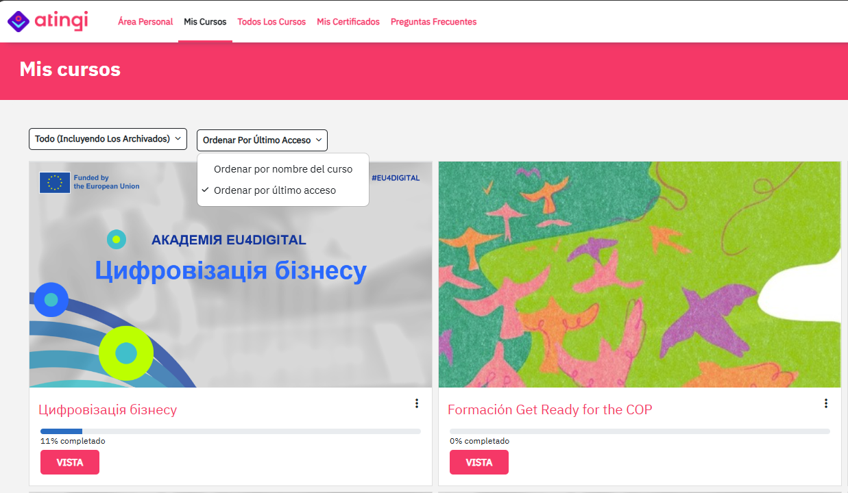 Puedes optar por ordenar los cursos por nombre o por último acceso o buscar un curso específico. Para ingresar a ellos nuevamente, simplemente haz clic en "Vista".