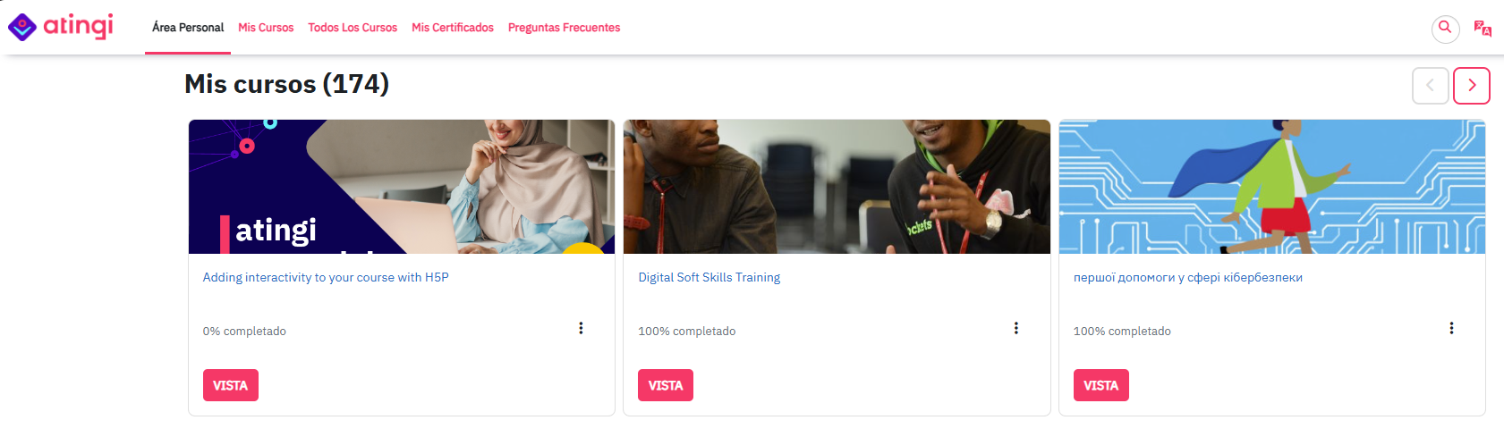 Una vez que hayas encontrado un cursos que te interese y en el que te hayas inscrito, puedes regresar para seguir aprendiendo en cualquier momento. Simplemente inicia sesión en tu cuenta atingi como de costumbre y haz clic en "Mis cursos" en la barra superior.