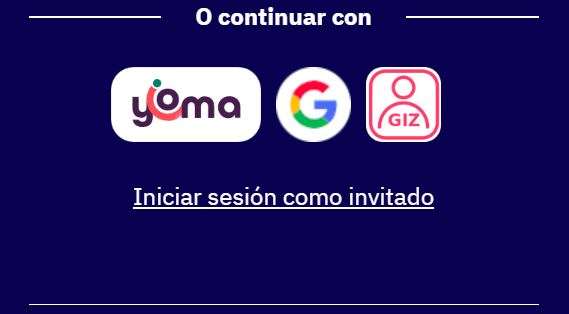 En la parte inferior de la página, dice "Or continue with". Si tienes una cuenta YOMA, haz clic en el botón "YOMA". Si tienes una cuenta de correo electrónico de Gmail, haz clic en el botón "G". Si tienes una cuenta de correo electrónico @giz.de, haz clic en el botón "GIZ".