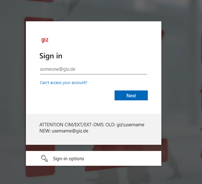 Después de haber hecho clic en el botón «GIZ», serás redirigido a a la página de inicio de sesión de GIZ. Introduzca aquí tu dirección de correo electrónico y contraseña asociadas a tu cuenta GIZ y haz clic en «Siguiente».