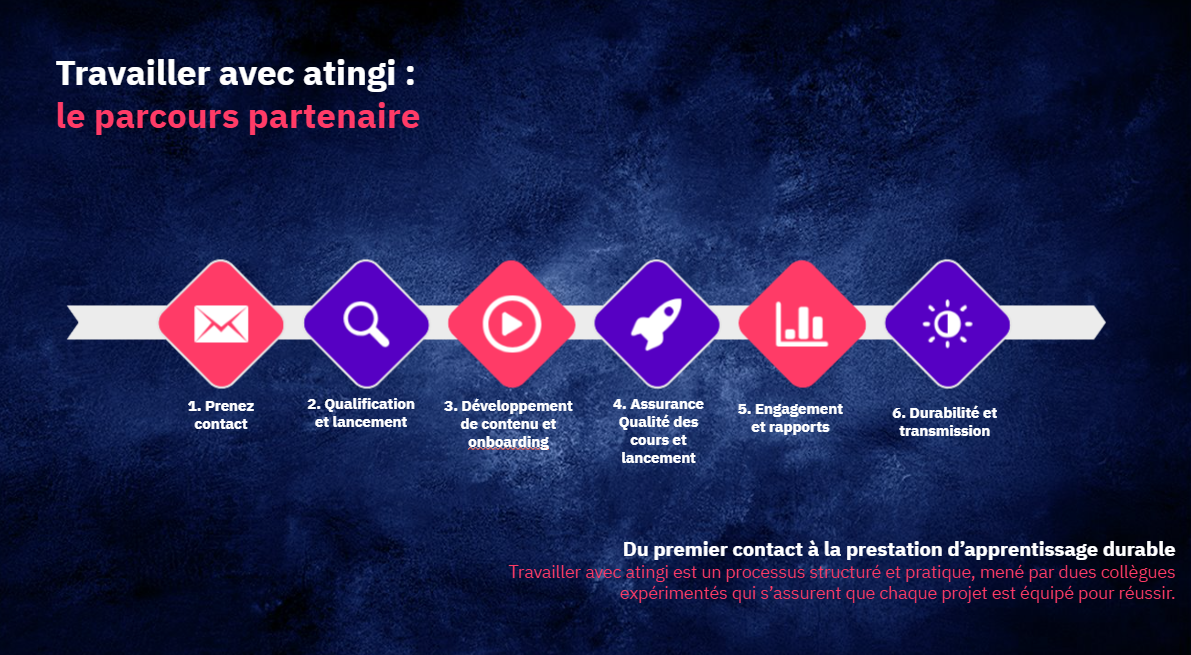 Au début de votre parcours de partenaire, votre responsable de réussite client atingi vous fera part de nos critères d'assurance qualité. Ce document peut servir de guide général lors de l'élaboration de votre formation. Au moins dix jours avant la date prévue pour le lancement de votre formation sur atingi, la liste de contrôle qualité doit être remplie par votre prestataire de services sur la base de la formation finalisée, puis renvoyée à votre responsable de réussite client. Notre équipe procédera alors à une vérification approfondie de la formation et vous fera part de ses commentaires.