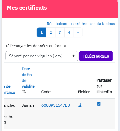 Vous pouvez facilement partager vos certificats en un seul clic depuis votre compte LinkedIn. Rendez-vous dans la section « Mes certificats » et faites défiler vers la droite. Vous y trouverez un bouton pour télécharger votre certificat et un autre pour le partager sur LinkedIn.