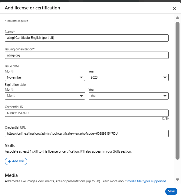 Veuillez noter que vous pouvez modifier le nom du certificat si vous le souhaitez avant de cliquer sur « Enregistrer ». Le certificat sera désormais visible sur votre profil LinkedIn sous la rubrique « Certifications ».