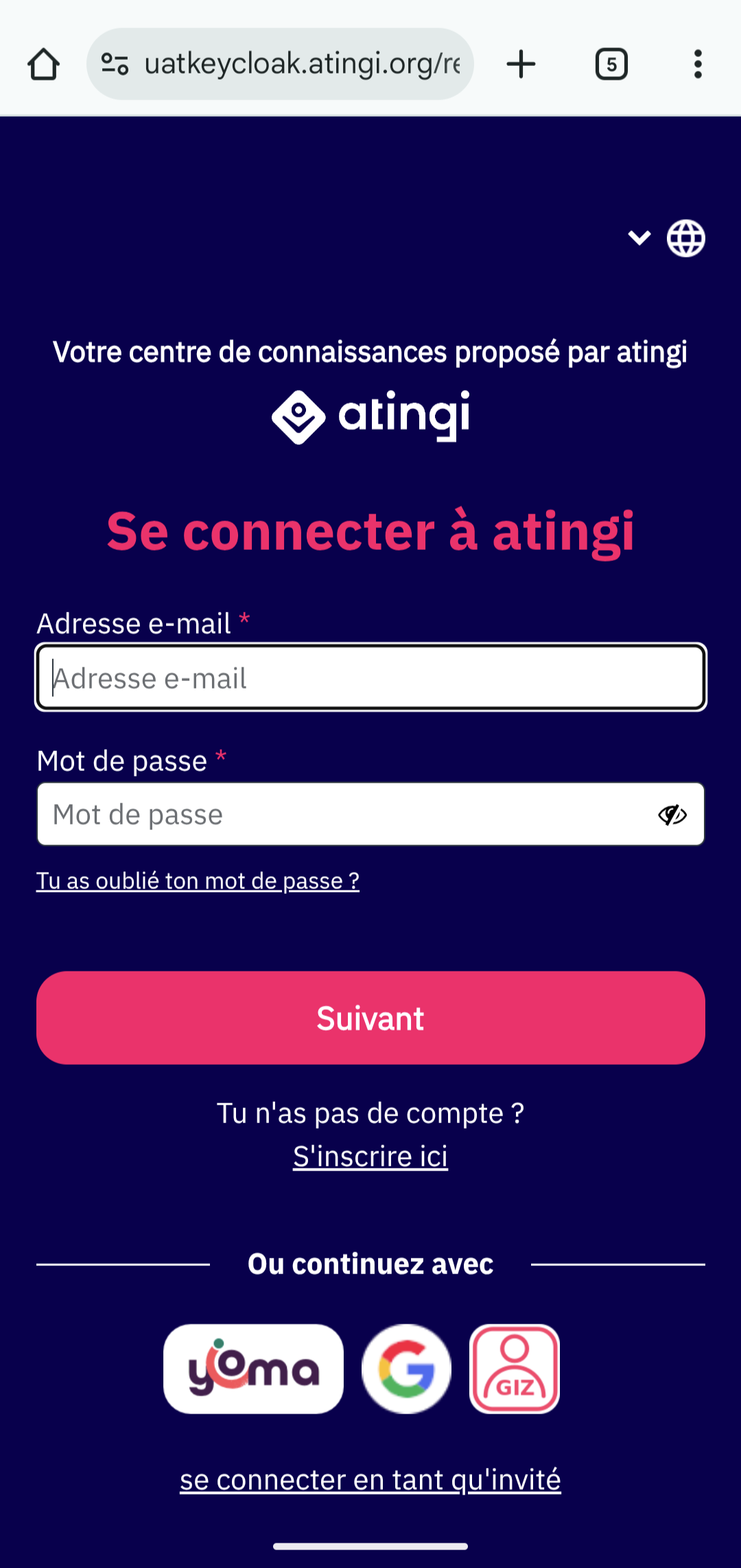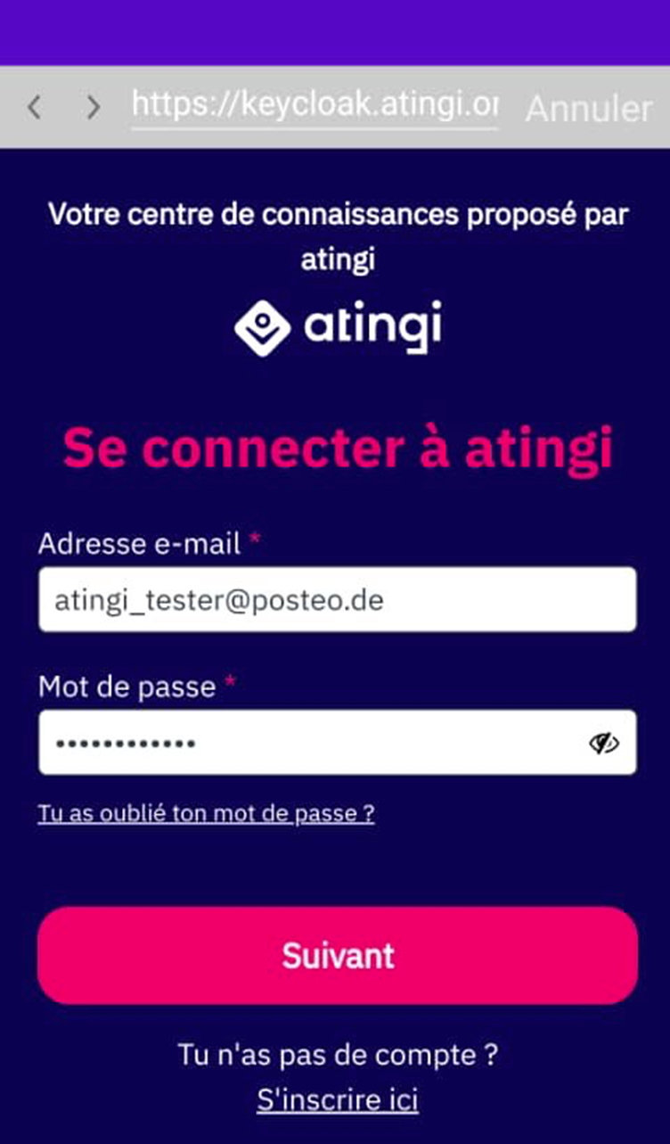 Il te sera demandé de te connecter à ton compte atingi. Si tu n’as jamais utilisé atingi auparavant, tu dois d’abord t’inscrire. Si tu as déjà un compte, clique sur « Se connecter ».