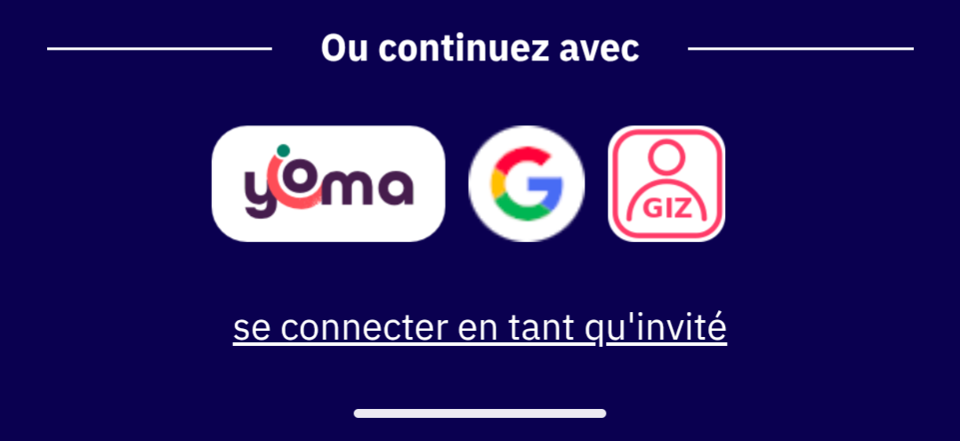 Si vous êtes un employé de la GIZ et que vous souhaitez vous inscrire ou vous connecter à atingi à l'aide de votre adresse e-mail @giz.de, vous devez utiliser l'option GIZ SSO. Si tu disposes d’un compte de messagerie « Gmail », il t’est également possible de te connecter via Google.