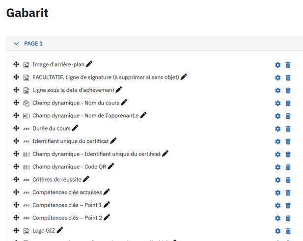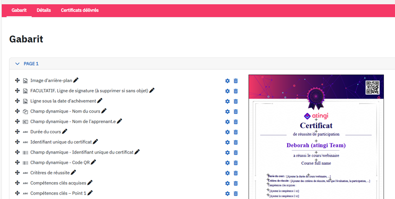 Pour supprimer des champs du gabarit, il suffit de cliquer sur l'icône en forme de poubelle située à côté du nom du champ concerné dans le menu de gauche. Par exemple, si vous ne souhaitez pas indiquer la durée de la formation sur votre certificat, il vous suffit de cliquer sur l'icône en forme de poubelle à côté de « durée de la formation » pour supprimer ce champ de texte.