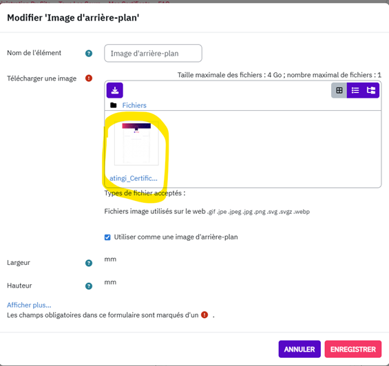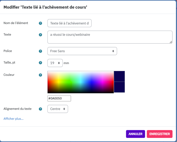 Remarque sur la langue : Si vous créez un certificat dans une langue autre que l’anglais, le français ou l’espagnol, vous pouvez traduire tous les champs de texte. Veuillez noter que chaque alphabet nécessite une police adaptée : il n’existe pas de police universelle. Pour vérifier l’affichage, vous pouvez tester avec votre propre nom dans l’alphabet concerné. Si le texte ne s’affiche pas correctement :