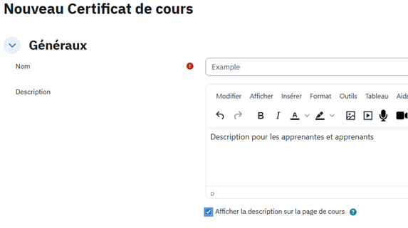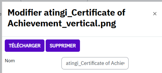 Nous proposons différentes versions linguistiques (anglais, français, espagnol, arabe, kinyarwanda). Ces certificats sont déjà entièrement configurés : il vous suffit d’en choisir un et de l’ajouter à votre cours en tant qu’activité. Pour les trouver et configurer correctement les paramètres, veuillez consulter le chapitre trois.