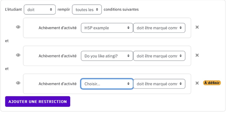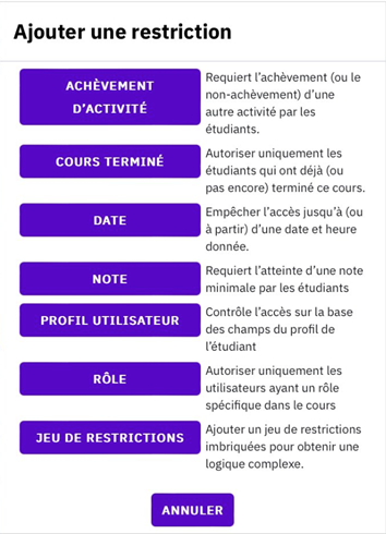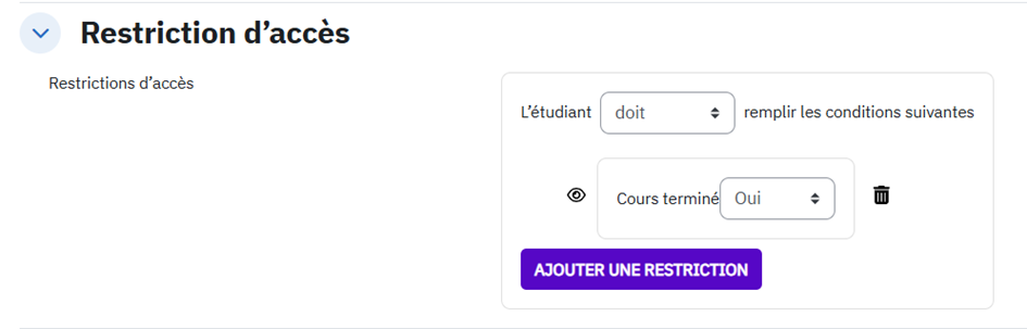 Nous recommandons d’utiliser la restriction : « Cours terminé ». Cela signifie que toutes les activités définies dans « Achèvement du cours » doivent être complétées.